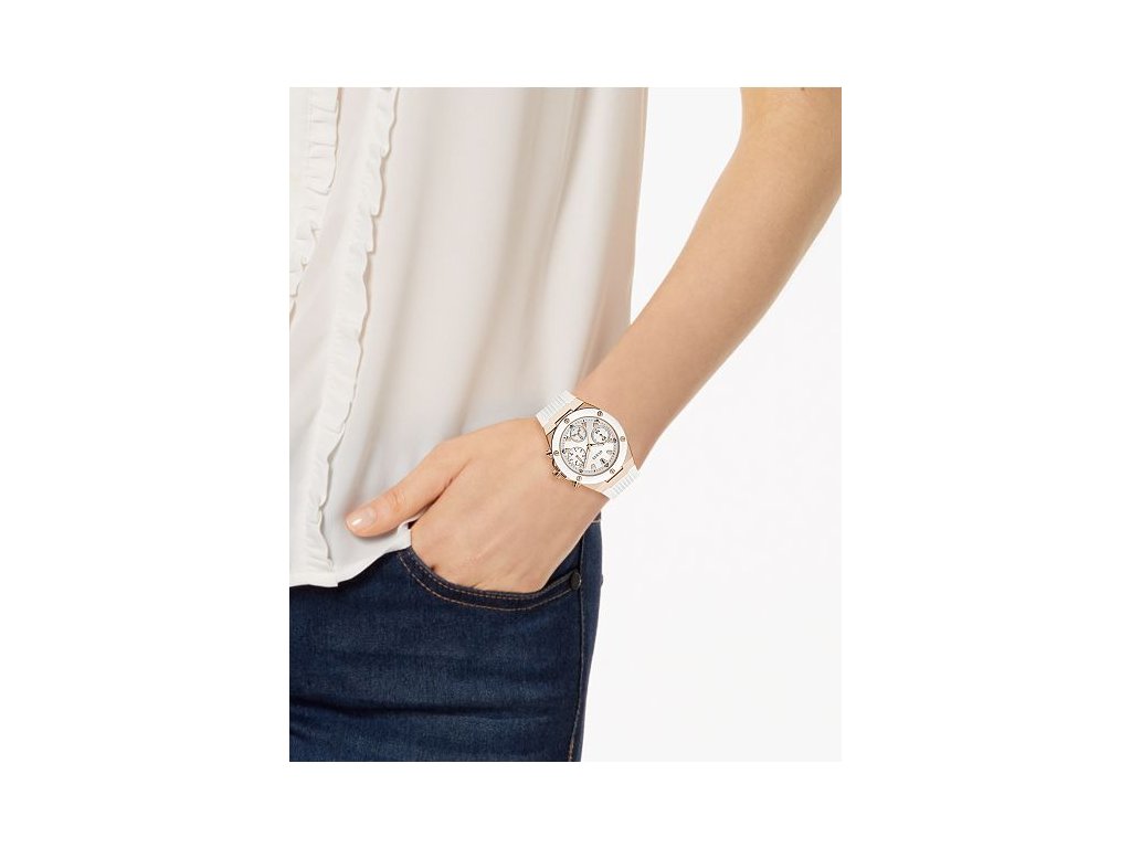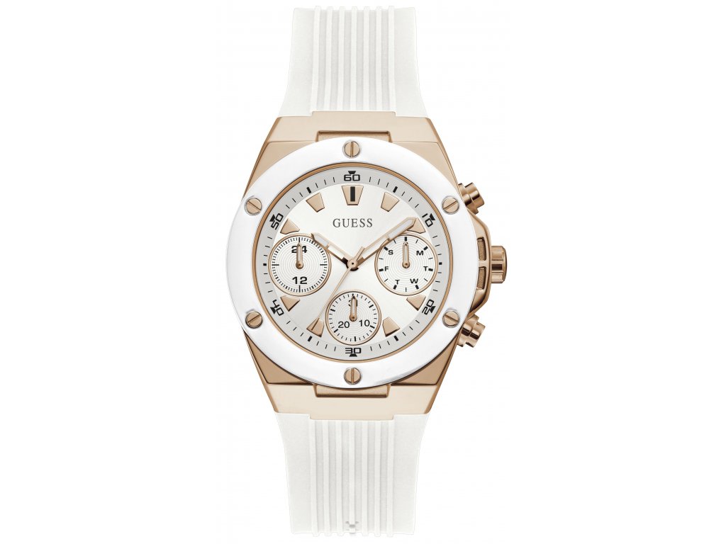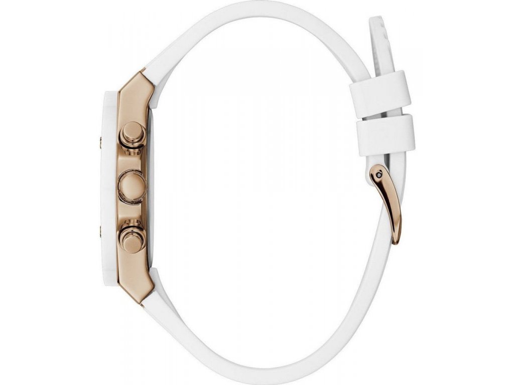 Dámske hodinky Guess GW0030L3, v krásnej kombinácii bielej farby s farbou ružového zlata. Plastový remienok bielej farby, ktorý je po dĺžke reliefovitý.