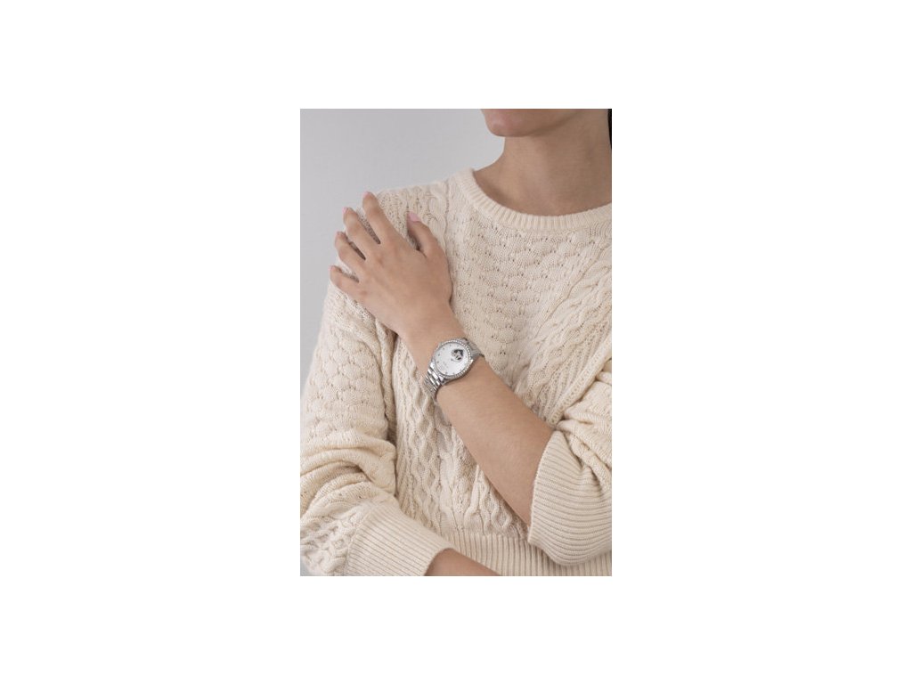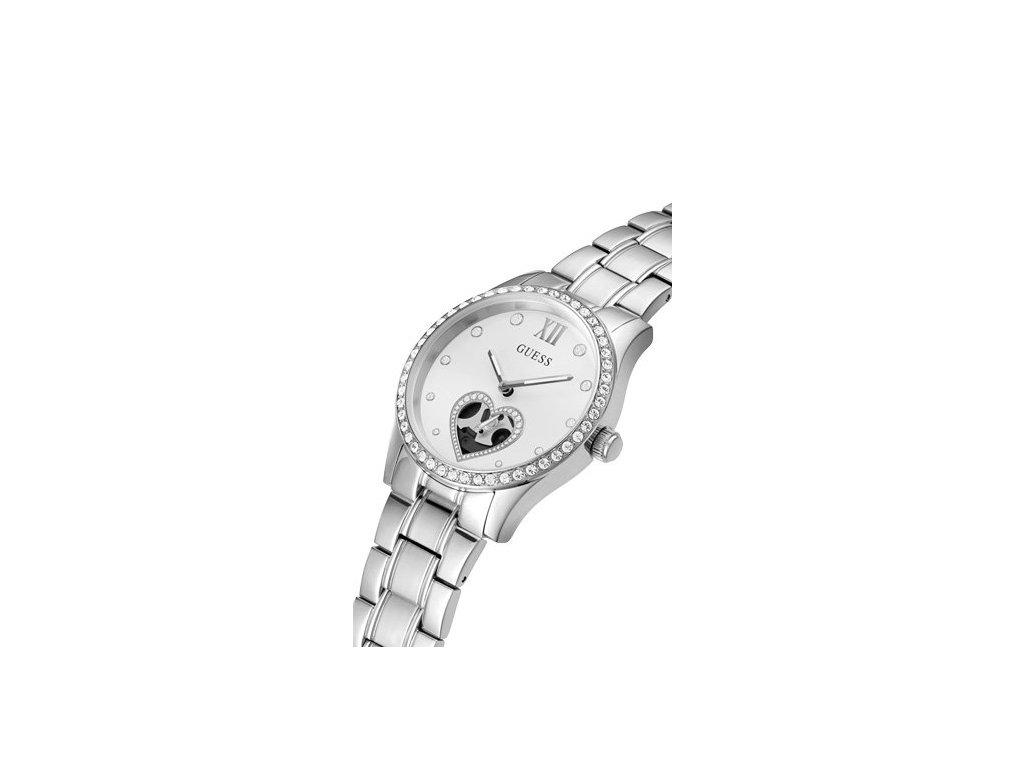 Hľadáte doplnok, ktorý bude vystihovať Váš štýl? Dámske hodinky Guess GW0380L1 sú ako stvorené pre romantické ženy so zmyslom pre krásu a jemnosť. Guľatý tvar pevnej obruby pokrývajú lesklé kryštáliky. Minimalistický displej nahradil ciferníkové číslice ozdobnými kamienkami, nechýba tu ani originálny motív v tvare srdiečka. Strieborné prevedenie hodiniek skvelo zažiari na ženskom zápästí. Článkový kovový remienok jednoducho nastavíte na požadovanú dĺžku.