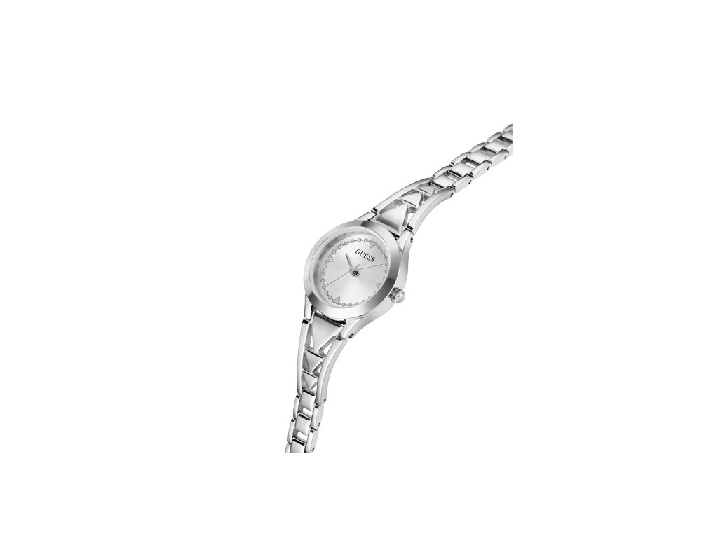 Dámske hodinky Guess GW0609L1 ponúkajú krásny moderný dizajn, ktorý zaujme aj vás. Model z kolekcie Tessa charakterizuje lesklé strieborné vyhotovenie z kvalitnej nerezovej ocele 316L. Nehrdzavejúca oceľ zaisťuje odolnosť a pohodlie, vďaka čomu sú tieto hodinky ideálne na celodenné nosenie. Už na prvý pohľad vyžarujú jemný minimalizmus a s ním spojenú ich jedinečnosť. Ciferník na displeji neobsahuje číslice, avšak je displej osadený žiarivými zirkónmi. Tenký článkový náramok má jednoduchý šperkový typ zapínania.