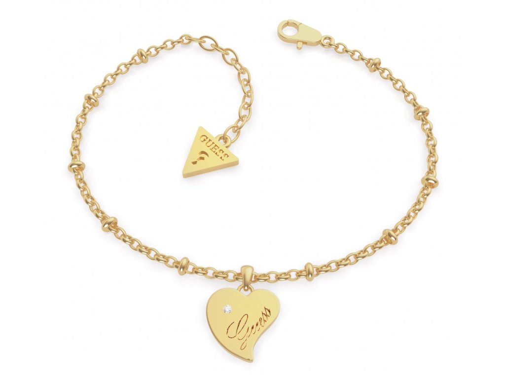 Dámsky náramok Guess UBB79010-S z chirurgickej ocele ponúka jednoduchý dizajn, ktorý dopĺňa prívesok v srdiečkovom tvare. Na srdiečku nájdete tiež názov samotnej značky, ako aj drobný kryštálik.