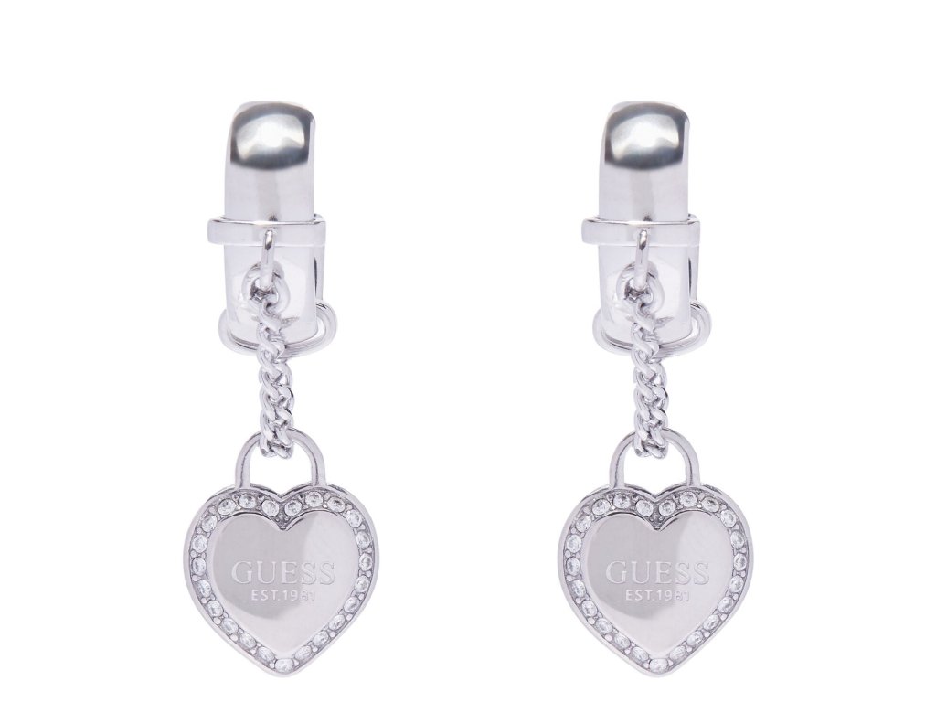 Dámske náušnice Guess JUBE01424JWRHT/U z chirurgickej ocele ponúkajú elegantný look, ktorý neostane bez povšimnutia. Strieborné krúžky sú doplnené o visiace ozdoby v tvare srdiečka. Tie sú spájané jednoduchou štýlovou retiazkou. Srdiečkové prívesky po ich obvode obohacujú drobné kryštáliky a v strede samotný názov značky.