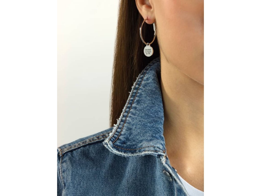 Dámske náušnice Guess UBE79056 z chirurgickej ocele ponúkajú elegantný dizajn, podľa ktorého hneď zistíte, o akého výrobcu sa jedná. Strieborné kruhy zdobia pliešky s logom Guess, mestom a rokom ich vzniku.