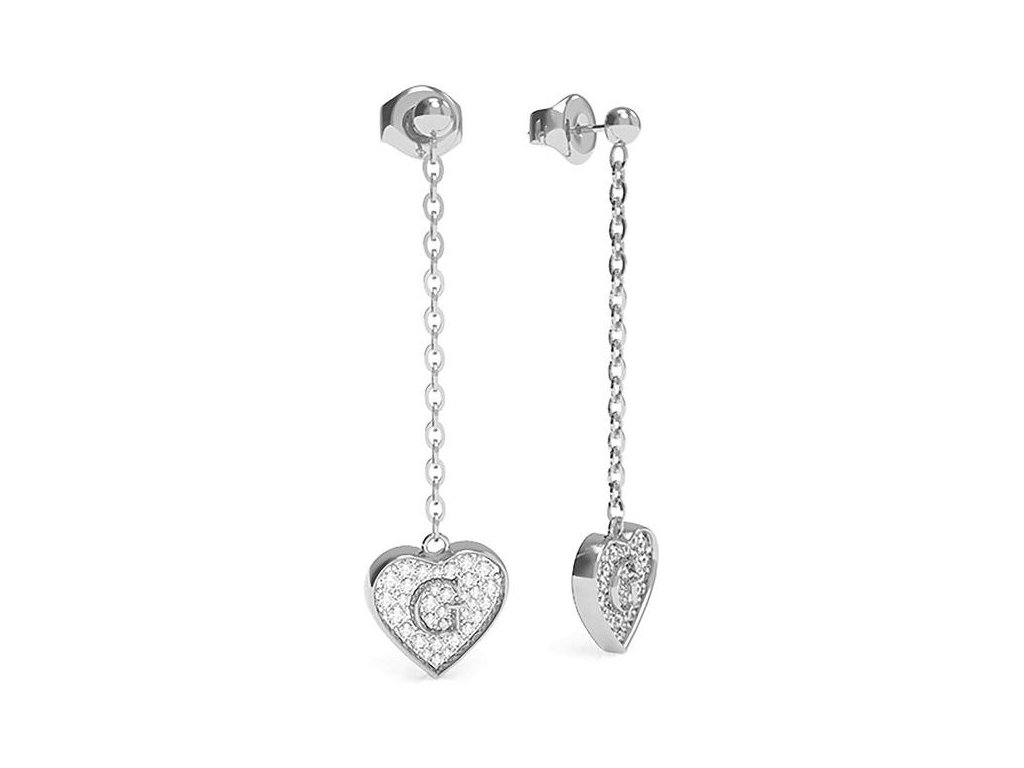 Dámske náušnice Guess UBE79076 z chirurgickej ocele ponúkajú elegantný ženský dizajn. Dlhé retiazky na ktorých nájdete strieborné srdiečka zdobí písmeno G a precízne spracované kamienky Swarovski.