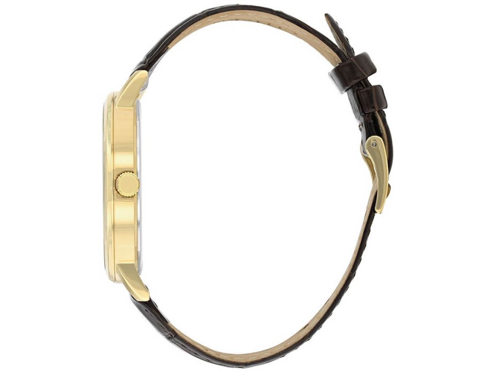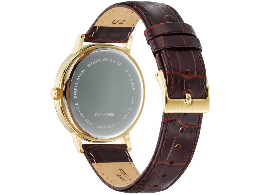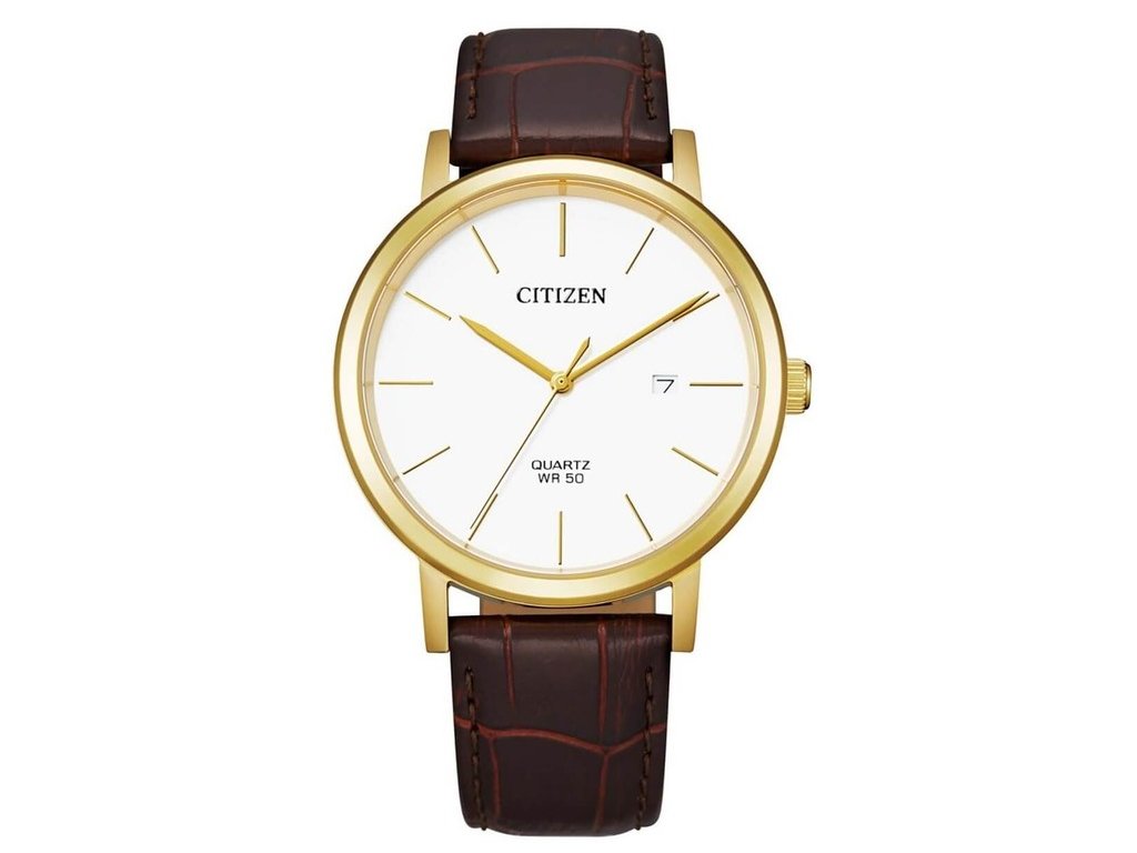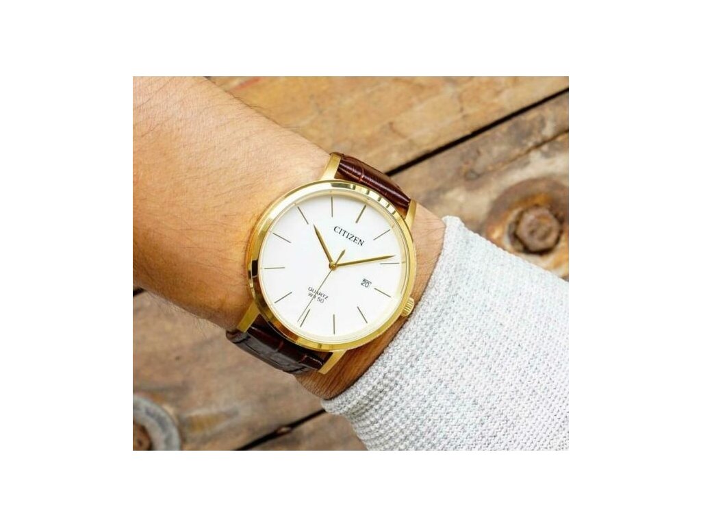 Krásne pánske hodinky Citizen BI5072-01A v jemnej zlatej farbe, s koženým remienkom. Koža a zlatá farba idú dokonalo k sebe a vytvárajú tak veľmi luxusný a neodolateľný vzhľad. Prilákajú pozornosť a nie málo komplimentov. Minimalistický až jednoduchý displej dopĺňa informácia o dni v mesiaci spolu s logom Citizen značky a značkou wr50, ktorá odporúča hodinky do maximálne 5ATM.