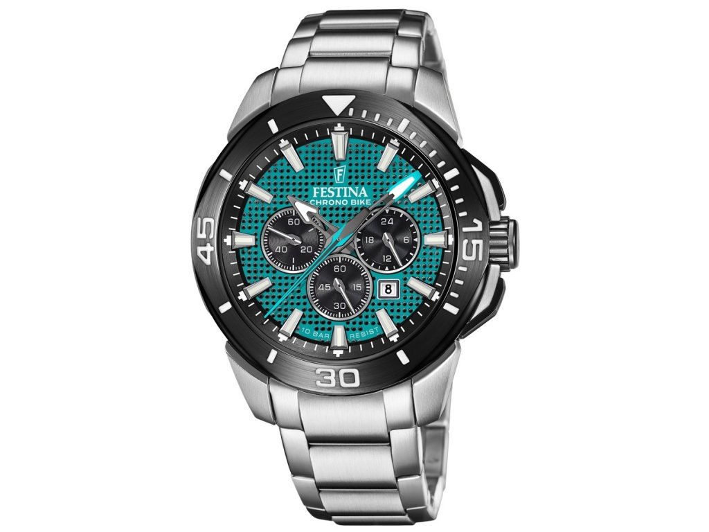 Kolekcia Chrono Bike sa pýši svojím nadupaným vzhľadom, ktorý si jednoducho zamilujete. Oceľové puzdro s priemerom 47mm a článkový remienok zaisťujú ich trvácnosť a odolnosť voči mechanickému poškodeniu. Minútová luneta v čiernom prevedení perfektne dopĺňa strieborné prevedenie tohto modelu. Výrazný tyrkysový displej pozostáva z jednoduchého ciferníku bez číslic, štýlových chronografov a indexov. Ručičky ako aj indexy sú luminiscenčné. Chronograf disponuje funkciou stopky. Vodeodolnosť je veľkou výhodou aj pri umývaní rúk – keďže netreba mať obavy z prípadného namočenia. Pri tomto modele sa jedná o vodeodolnosť až do 100m (plávanie).