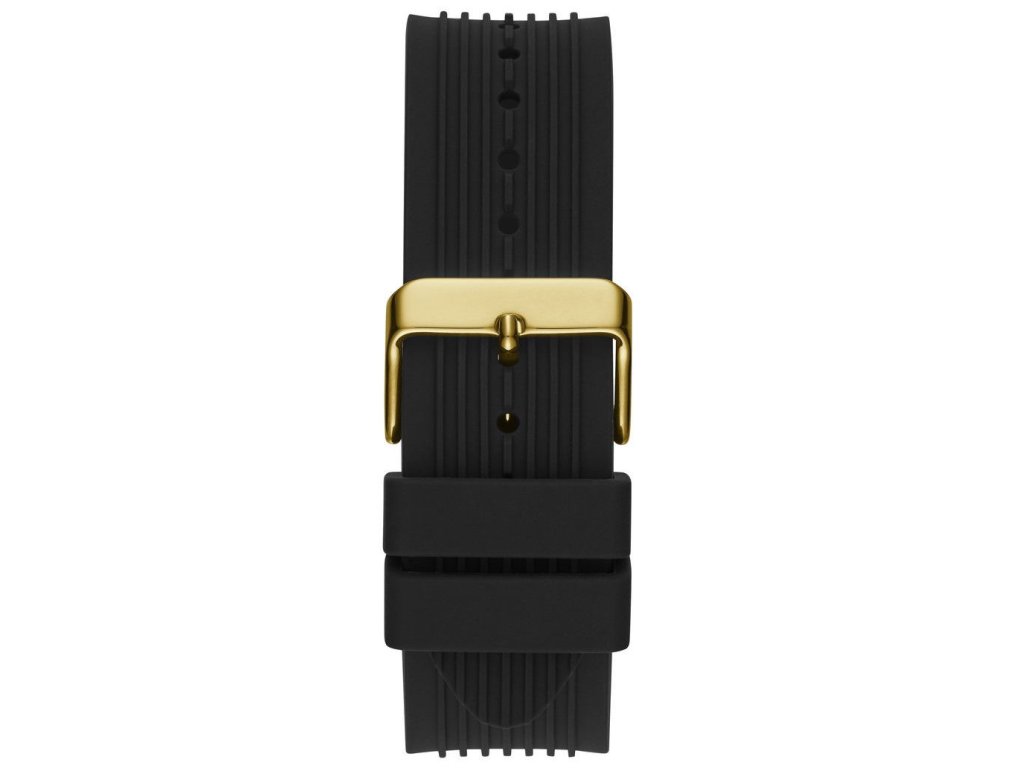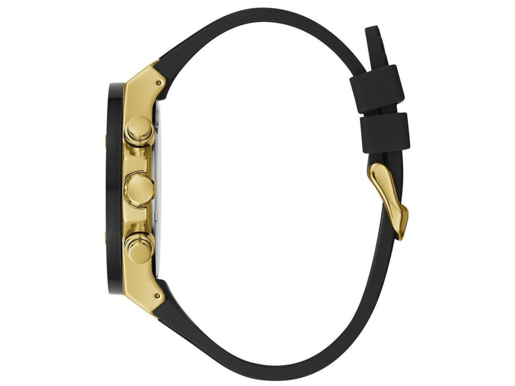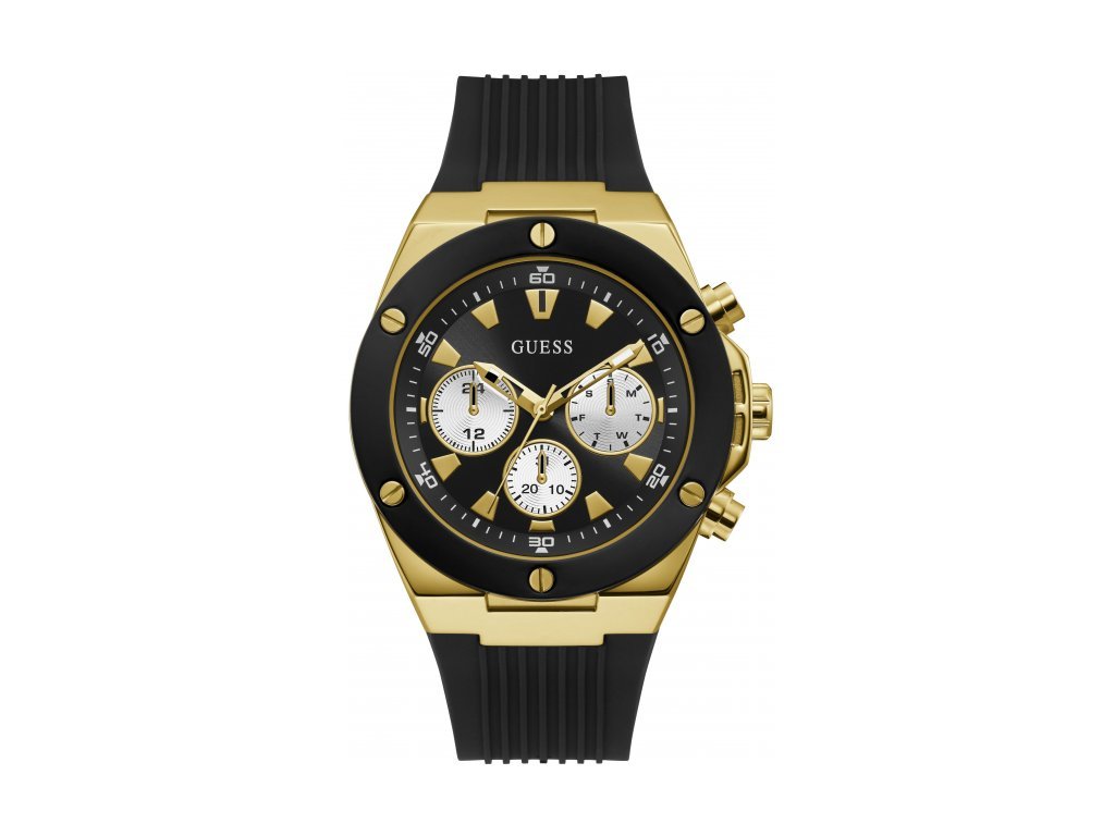 Pánske hodinky Guess GW0057G1 s plastovým(kaučukovým remienkom). Krásna kombinácia zlatej a čiernej farby. Na displeji sú tri chronografy, ktoré ukazujú dátum, deň v týždni a 12/24 hodinový ciferník.