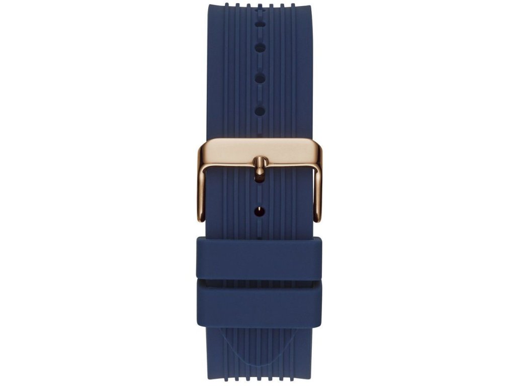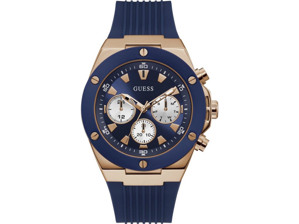 Pánske hodinky Guess GW0057G2 s plastovým (kaučukovým remienkom). Krásna kombinácia ružovozlatej a modrej farby. Na displeji sú tri chronografy, ktoré ukazujú dátum, deň v týždni a 12/24 hodinový ciferník.