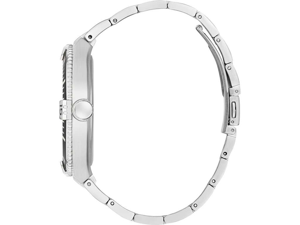 Čierny displej je jednoduchý, nenájdete na ňom číslice, iba minimalistické indexy. Vrúbkovaná obruba dodáva tomuto modelu svoju jedinečnosť. Hodinky disponujú obľúbenou funkciou dátum. Jednoduché zapínanie.